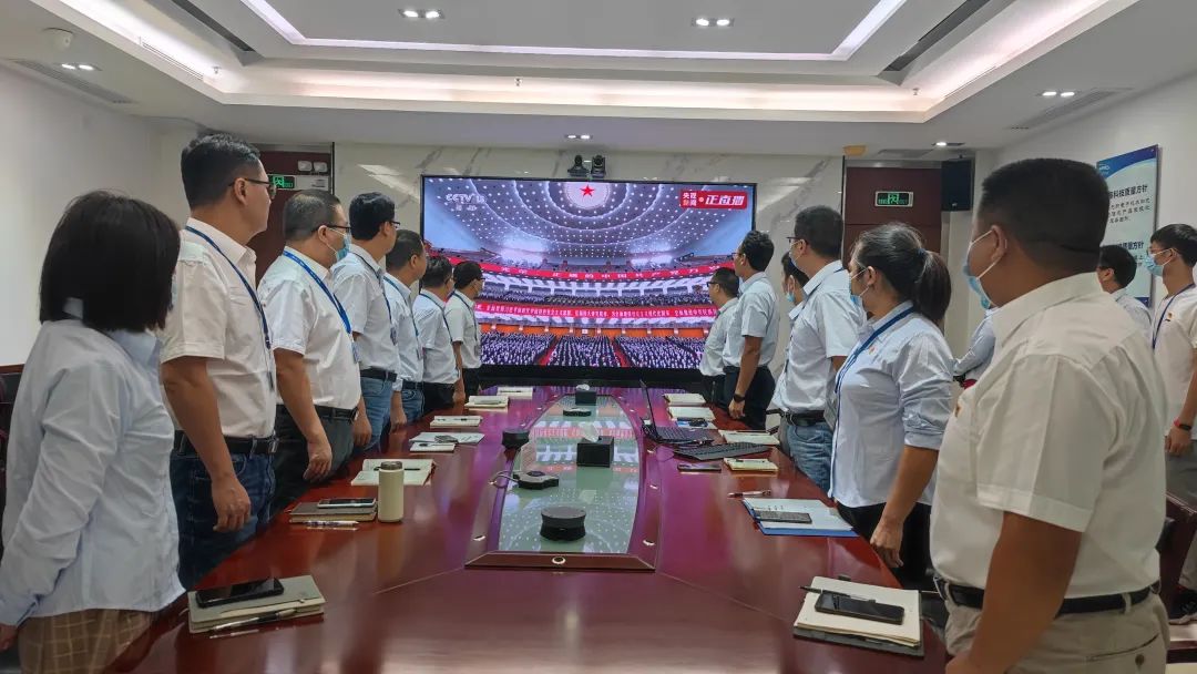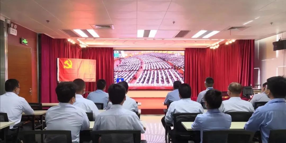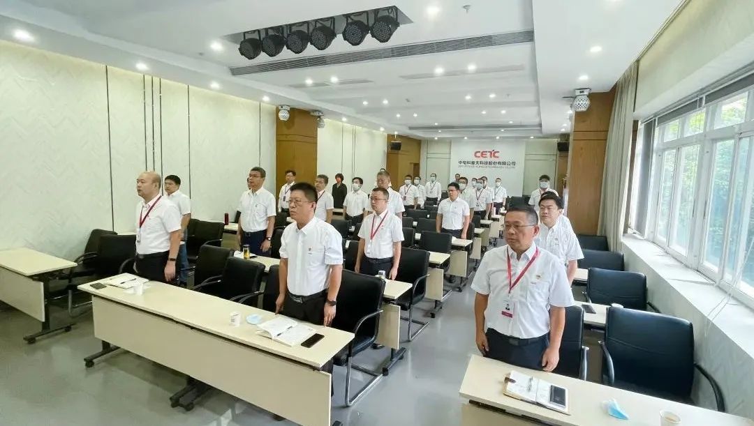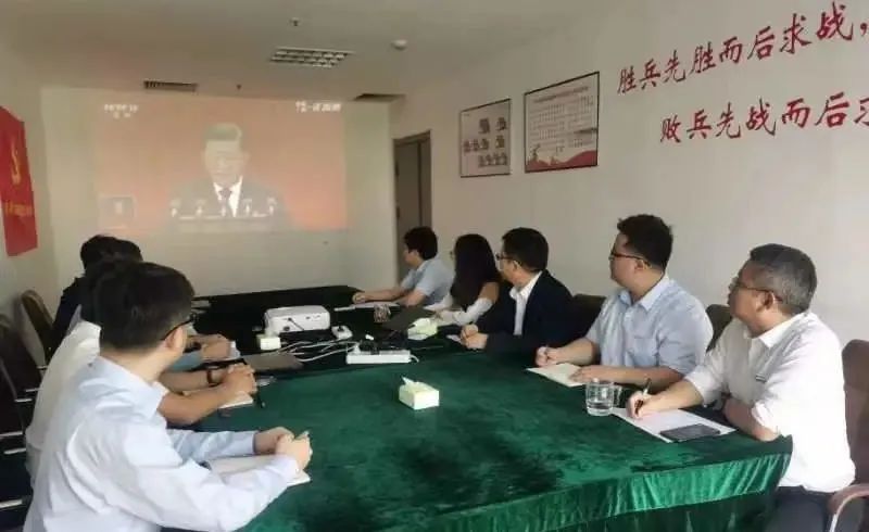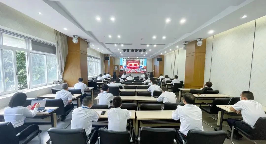 中电科普天科技组织党委委员、经营班子、支部书记、部门负责人在208会议室集中收看党的二十大开幕会直播盛况。